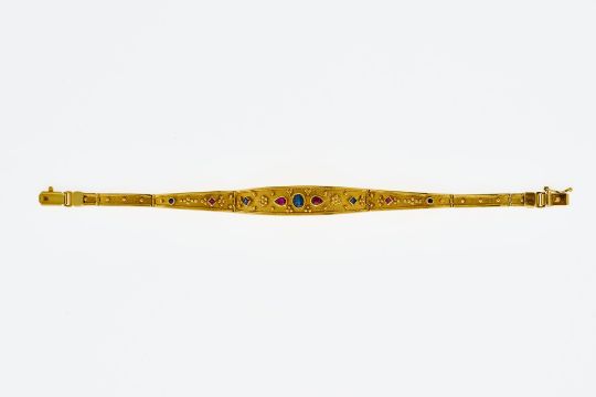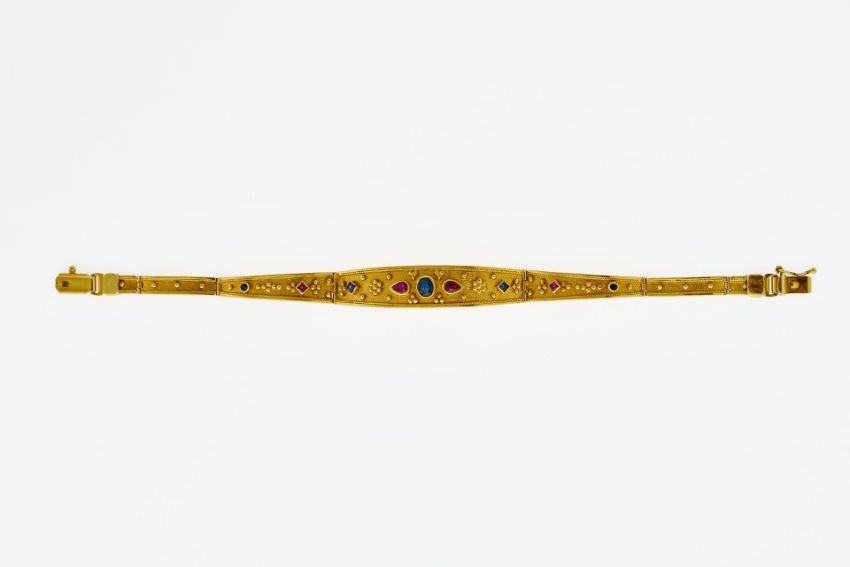 GG 585. Längliche, mit Scharnieren verbundene Glieder mit feinem Kugel- und Filigrandekor. Die Mittelpartie besetzt mit kl. facettierten Rubinen und Saphiren. Kastenschloss mit Achtersicherung. L. 19 cm. 20,1 g.