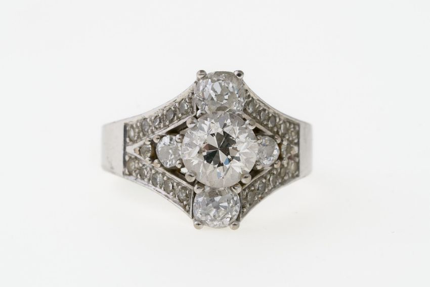 WG 750. Durchbrochen gearbeiteter Kopf mit zwei Spitzen, ausgefasst mit feinem Diamantpavé. Mittig ferner besetzt mit einem Brillanten von etwa 0,90 ct, erhaben von vier Krappen gefasst und flankiert von zwei Altschliffdiamanten mit jeweils ca. 0,25 ct sowie zwei weiteren Altschliffdiamanten mit je ca. 0,10 ct. Meistermarke 'Z'. Gr. 55 8,2 g.