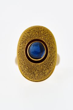 GG 750. Großer hochovaler Kopf, schauseitig fein granuliert. Im Zentrum sitzt in abgesenkter Mitte ein runder Saphircabochon, der von einer Zarge gefasst ist. Meistermarke 'ET', Elisabeth Treskow, Köln, ca. 1950er/1960er Jahre. Polierte Schiene, Gr. 53. 12,1 g.