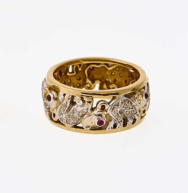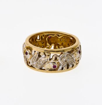 GG/WG 585. Durchbrochener Gelbgoldring, ringsum Dekor in Form reliefierter Elefanten, die stilisierten Körper partiell in Weißgold abgesetzt und mit kl. Diamanten ausgefasst. Besetzt mit kl. Rubincabochons als Augen. B. 0,9 cm. Gr. 55. 7,5 g.