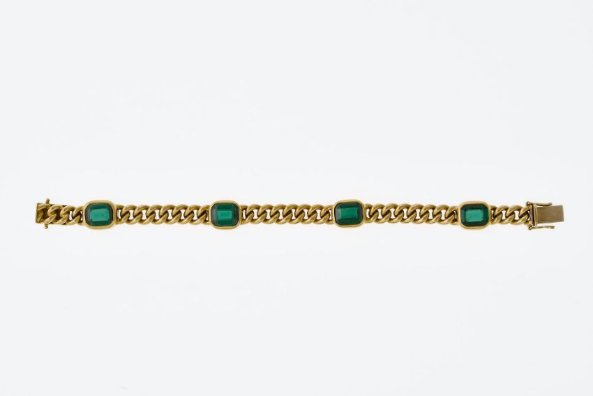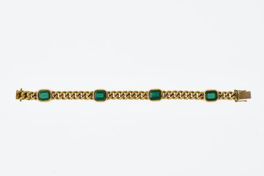 GG 585. Rundpanzermuster unterbrochen von vier Zargenfassungen, jeweils besetzt mit einem oktogonal im Treppenschliff facettierten grünen Turmalin (ca. 7,5 x 9,5 mm). Unterbautes Kastenschloss mit doppelter Achtersicherung. L. 17,3 cm. 35,8 g.