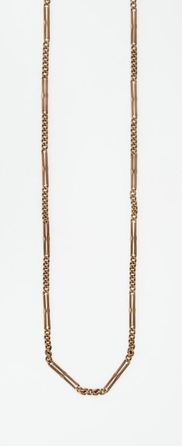 RG 333 (Punze unkenntlich, geprüft). Rundpanzermuster im Wechsel mit langgezogenen, taillierten Ovalgliedern. Mit Karabiner und Federring. L. 47 cm. 12,4 g.
