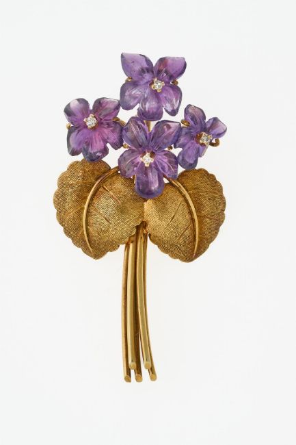 GG 585. Bouquet mit vier fein in Amethyst geschnittenen Blüten (ein Blatt beschädigt), jeweils besetzt mit einem kl. Achtkantdiamanten. Glatte Stängel, satinierte Blätter mit gewellten Kanten. Schiebesicherung. L. 4,8 cm. B. 2,6 cm. 9 g.