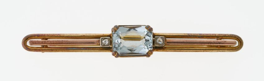 GG 585. Stabförmige, von langgezogenem Oval umwundene Front (angelaufen), mittig besetzt mit einem oktogonal im Scherenschliff facettierten, hellblauen Schmuckstein (vermutlich Aquamarin). Flankiert von zwei kleinen Diamantrosen in Weißgoldfassungen. Schiebesicherung. Ca. 1940er Jahre. 7,7 g.