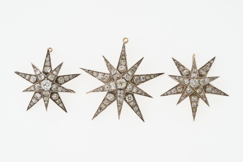 GG 585 (nicht punziert, geprüft, Schauseiten Silber. Drei zehnstrahlige Sterne in zwei Ebenen gearbeitet und jeweils komplett ausgefasst mit Altschliffdiamanten in mittlerer Qualitätsstufe. Zusammen etwa 5 ct. Jeweils mit schöner Bogengalerie, mittig Schraubgewinde, zwei Klemmbügel und eine kleine Öse mit Scharnier zum Versenken. Ca. Ende 19. Jh. ø 4 cm und ø 3,2 cm. Zusammen 22 g.