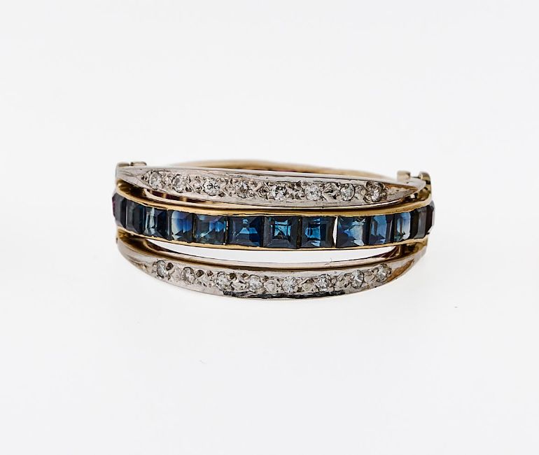 GG/WG 585 (nicht punziert, geprüft). Gelbgoldschiene, rundum jeweils zur Hälfte besetzt mit 15 Rubin- und 13 Saphircarrés. Flankiert von zwei diamantbesetzten Bügeln in Weißgold, die wechselnd zu einer Farbseite umgeklappt werden können. Gr. 54. 4,2 g.