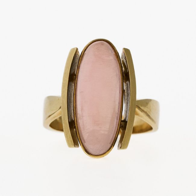 Mid-Century Ring: GG 585. Länglich-ovaler Kopf besetzt mit einem Rosenquarz-Cabochon in glatter Zargenfassung. Flankiert von zwei abgesetzten Wangen. Gr. 56. 8,9 g.